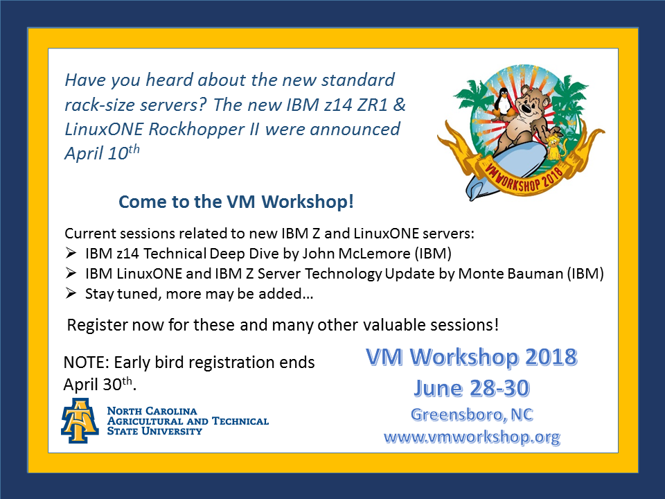 See more VM Workshop visuals below! Sessions including z/VSE 6.2 hot topicsGet up to speed on Linux on IBM Z and the newest LinuxOne More details regarding our request for session submissions Sessions Focused on the Latest Release of z/VM Announcing 2018 VM Workshop and request for sessions submissions |